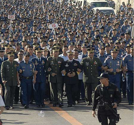 2月25日,数千高级军警官员手挽手走到军方总部,以示对阿罗约的效忠和支持。