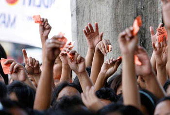 4月18日,菲律宾马尼拉,大批贫民手持对换劵拥挤在一起