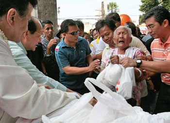 4月18日,菲律宾马尼拉,大批贫民手持对换劵拥挤在一起,等候领取装有大米和罐头的礼物包。这是菲律宾前总统埃斯特拉达为庆祝自己71岁生日,而特意向穷人施舍的。