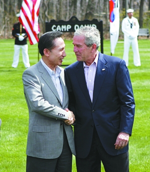 4月19日,美国马里兰州戴维营,布什与李明博握手共庆两国关系升级。