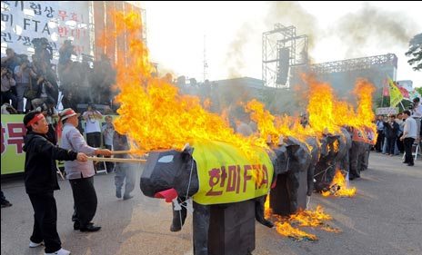 上百名游行示威者在首尔市中心烛光守夜,抗议李明博政府恢复进口美国牛肉,漠视民众对疯牛病的担心。警察随即驱散游行者,并以非法占用街道需接受审讯为由逮捕了37名拒绝驱散者。