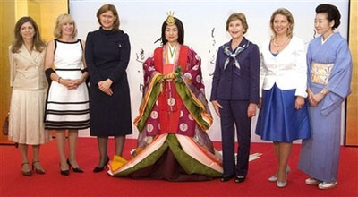 据日本共同社报道,茶会在洞爷温莎酒店内举行,美国总统布什夫人劳拉等6位首脑夫人参加了茶会。身着浅蓝色和服的贵代子夫人在专为此次茶会布置的茶室内亲自点茶待客。