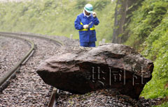 因发生地震,一块巨大的岩石滚落到日本电车山田线的轨道上。(共同社图)