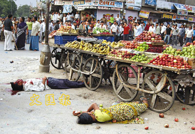 艾哈迈达巴德市的市集上,两名遇袭者倒卧在水果档旁。