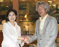 日本前首相小泉纯一郎与前防卫相小池百合子握手。(共同社图)