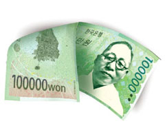 韩国政府原计划于明年年初发行的10万韩元面值的纸币。