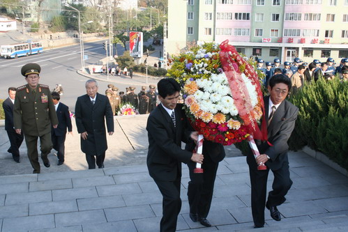 友谊塔前,朝鲜人民军仪仗队身着戎装,英姿飒爽。伴随着军乐队庄严的奏乐声,朝鲜劳动党中央委员会、最高人民会议常任委员会和内阁、人民武力部、外务省、人民保安省、贸易省、文化省、朝中友协和对外文委、平壤市党委和人民委员会向友谊塔敬献了花圈。花圈缎带上写着“光荣属于中国人民志愿军烈士”。朝鲜最高人民会议常任委员会秘书长崔永林、人武部副部长朴在京、外务省副相金永日、贸易省副相李明山、朝中友协副委员长兼对外文委副委员长田英进等朝领导人和部门负责人及百余名各界群众出席了仪式。