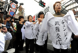 同时,日本在野党民主党派出了三位高官夫人——民主党最高顾问、日本前首相羽田孜的夫人绥子、代表代行菅直人的夫人伸子、干事长鸠山由纪夫的夫人幸。“三夫人军团”身穿厨师样式的服装,上书“改变!政权替换”,来到东京巢鸭的购物街,和正在购物的家庭妇女一一握手。其间,一名60岁的老婆婆一脸郁闷,说“我已经在很努力削减家庭开支了,可是国家还是在浪费。”三位夫人马上建议说,“下次让民主党执政看看吧!”
