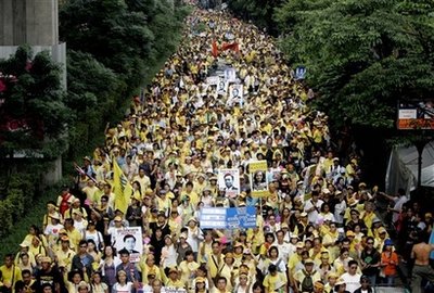 中新网10月31日电 据“中央社”报道,泰国拥政府派誓言10月31日展开集会,加上反政府的人民民主联盟群众30日凌晨遭手榴弹攻击,社会对立的紧张气氛高涨。分析认为,紧张气氛恐怕在11月1日前总理他信越洋联机活动当天达高峰。