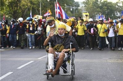 泰国反政府的人民民主联盟抗议,24日转战曼谷旧的廊曼机场,出现冲突场面,警察被推倒,还有人动手又动脚,所幸其它警察赶紧将这位落难的同事拉了出来,而抗议领袖也要求大家冷静守秩序。