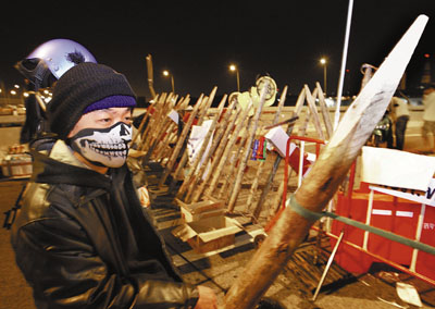 示威者决意跟警方一拼,他们以长达3公里的刀片铁丝钢包围新机场,并在路上设置路障。示威者戴上眼罩和头盔,他们的警卫更手持铁叉和金属棒巡逻,部分人甚至在衣服内藏着手枪。警方指约4000名民盟示威者在新机场聚集,旧机场则有2500人。