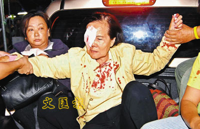 被炸伤的一名黄衣示威者眼部血流不止,在其它人协助下撤离现场