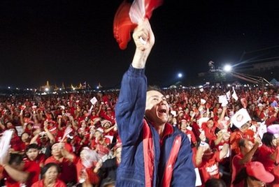 抗议群众阻断在泰国首都国会大厦前的道路,围住国会入口,誓言将留守直到阿披实辞职。