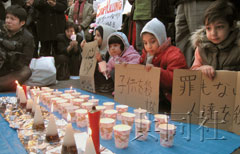 在日本警方的关注下,抗议者们打出了写有“不要杀害儿童”、“不要战争”等内容的纸板和横幅,并依次向摆放在地上的约50盏蜡烛献花,祈祷死者安息。