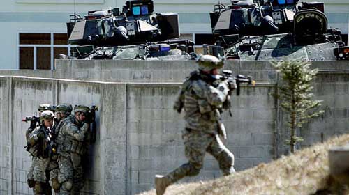 中新网3月11日电 据韩国《中央日报》报道,10日是韩美“关键决断(key resolve)”联合军事演习的第二天,京畿道抱川驻韩美军罗德里格斯(Rodriguez)射击场上,韩美海军展开巷战训练。美军士兵正朝着假想敌军占领的建筑物前进。