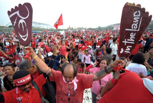 红衫军于周六黄昏五时起到曼谷皇家田广场再次举行反政府集会活动,约有数千人参加。