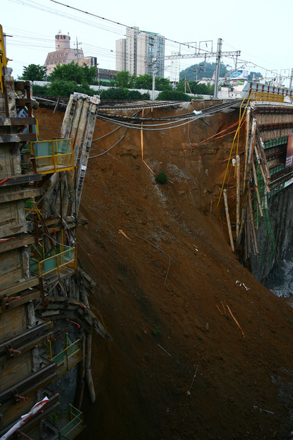 据了解,加佐站当时正在进行连接京义线与仁川机场线电车的换乘工程,事故起因于水道管的破裂,造成了长20米宽30米的塌方。