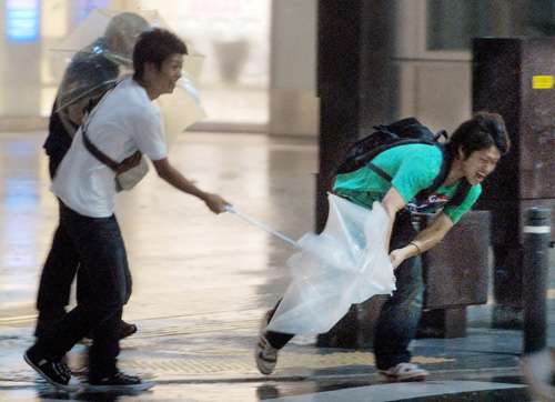 多家电视台播映惊涛骇浪扑岸、广告牌坠毁和大批脚踏车翻倒地的镜头。