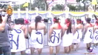 中新网曼谷9月12日电 综合报道,泰国曼谷10名被企业解雇的制衣女工昨天早晨到市政厅前示威,要求政府代她们向雇主索讨裁员赔偿。她们在市政厅大门前除下衣服,全身只包着一条大毛巾(见图)。