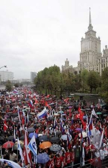 俄罗斯亲克里姆林宫青年组织“纳什”1万多名成员7日为总统普京庆祝55岁生日,他们冒雨在莫斯科巿中心高呼生日祝贺语。