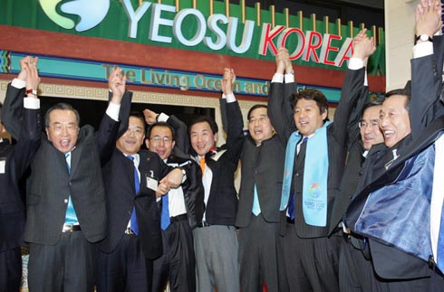 进入大会场的韩国代表团接到成功申博的消息后,在大会场旁边焦心等待的申博团和助威团等600多人一齐高喊“万岁”,庆祝丽水成功申办世界博览会。