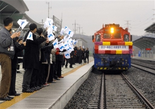 据悉,该货运列车由1个火车头、10节货车厢和1节乘务员车厢等共12节车厢组成。在首次运行中将装载道路界碑和工业园区建设材料等开往朝鲜,返回韩国时则运回开城工业园区生产的鞋、衣服和钟表。