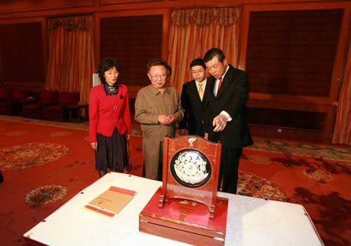 刘大使向金正日总书记赠送北京奥运纪念银盘(图片来源:外交部网站)