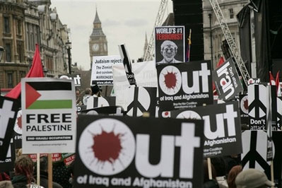 大批民众在伦敦市中心抗议伊拉克战争,要求美国尽快撤军。