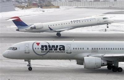 一架达美航空的航班将要起飞,旁边停靠的是一架西北航空的航班。(资料图)