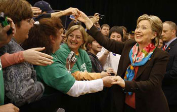 据香港《大公报》报道,位于波士顿的萨福克大学二十一日所公布的调查结果显示,经过数星期的全力拉票,前第一夫人希拉里在有可能去投票的选民当中,取得百分之五十二支持,高于争取成为美国首位黑人总统的伊利诺伊州参议员奥巴马所得的百分之四十二。