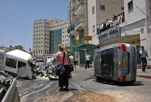 共有五六辆汽车被撞扁,另有一辆被撞翻。还有一辆巴士也被推翻,另一辆巴士严重受损。以色列国家拯救局证实有两人死亡,另有两具尸体躺在地面一动不动。当地电视报告说,共有四人死亡。