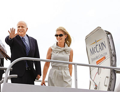 麦凯恩民望追平奥巴马,夫妇登上专机时笑容满面。