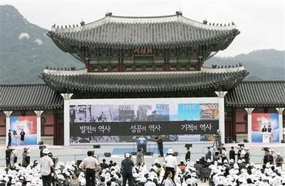 李明博15日在景福宫广场举行的光复节纪念仪式上发表演讲。