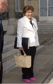 今天的内阁会议完毕,信守诺言的巴舍洛特-加龙省穿着粉红塑料鞋走出来,引起媒体记者大笑,她也开心地停下来让摄影记者拍照。