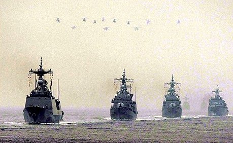 由50余艘军舰和30余架飞机参加的海上阅兵仪式十分壮观。
