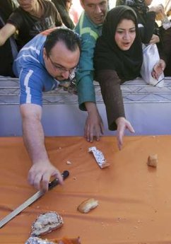 中新网10月19日电 据台湾中广新闻报道,伊朗做出刷新世界纪录的特大号三明治,可是还来不及完成认证,就被围观的群众抢食一空。