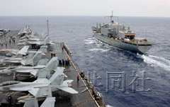 17日不时下着大雨,上午补给舰与航母并列航行,相距仅约60米,同时通过钢缆向航母补给蔬菜、水果等生鲜食品。下午到夜间,装有导弹等的训练弹的战斗机在航母上反复进行间隔数十秒的起降实战训练。