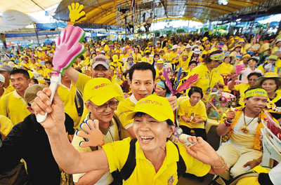 曼谷穿黄衣的反政府示威者在总理府内发动造势大会。