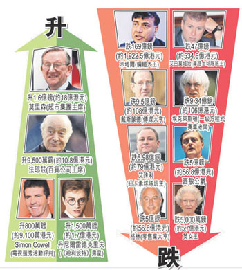 富豪门坎已大为降低,去年上榜的身家最少要有8000万英镑,今年降至5500万英镑,是2003年起首次要降低门坎,尽管如此,部分富豪仍难免跌出榜外。