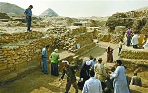 埃及考古人员在塞加拉古葬场挖掘金字塔基座。