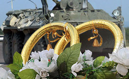 由一辆货真价实的装甲运兵车引导的婚礼车队沿着列宁大街飞驰。庞大的装甲运兵车装饰着彩带、蝴蝶结和一块写着“新郎哥们”的牌子。尽管在由外国品牌轿车组成的车队中显得有些别扭,但的确吸引了路人的眼球。