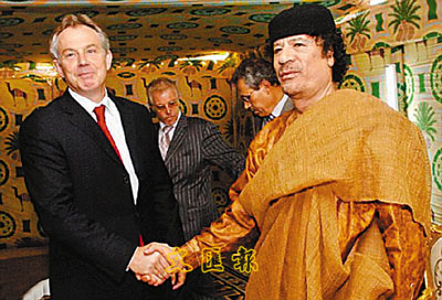 据香港《文汇报》报道,布莱尔在2004年3月到访的黎波里,不但与利比亚领袖卡扎菲进行历史会晤,双方还达成协议,让英国调查员到当地调查1984年发生在英国大使馆的一宗枪杀案。期间,卡扎菲把骆驼座鞍赠送给布莱尔以示友好,更象征着英国把利比亚重新带返国际社会。