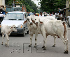 印度路上的牛很多是以前被饲养因产不出牛奶或变老而被抛弃,或是因放养而闯到路上的。在印度禁止食用作为神灵的“牛”肉。就没有人想要抓那些迷路的牛。即使那些牛在道路中间成为交通的障碍,在路上逆行,市民们也都会避开。