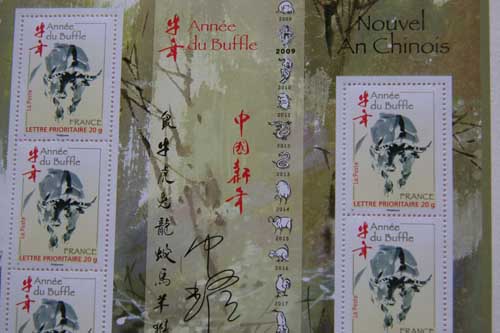 法国自1849年开始制做邮票,至今已有160年历史。1998年,法国第一次开始制做发行中国邮票,两枚邮票的主图为中国的故宫和法国的卢浮宫。从2005 年起,法国连续发行了鸡、狗、猪、鼠、牛中国生肖邮票。除了鸡年邮票图案由法国画家米耶创作设计,书法由中国旅法画家李中耀执笔外,其余生肖邮票的设计都被华人画家竞标获得,包括今年在内,李中耀先生在竞争中3次脱颖而出。