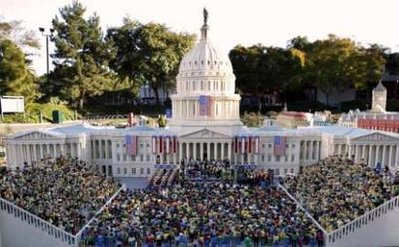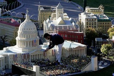 中新网1月17日电 为庆祝奥巴马20日就任美国新总统,模型玩家麦克因提尔15 日在加州卡尔斯巴德市乐高乐园以乐高积木搭成一座仿真总统就职典礼的模型。