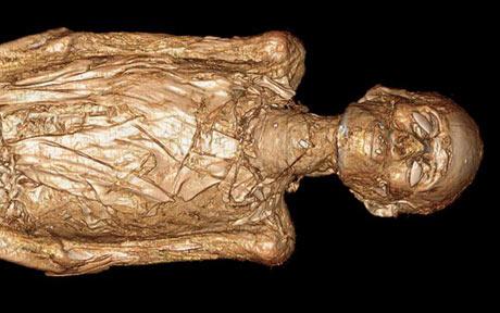 据英国媒体报道,美国芝加哥大学科学家日前利用X光扫描设备扫描的这具木乃伊被认为是公元前800年,埃及底比斯神庙祭司时一名唱歌妇女的尸体。考古学家从安放该木乃伊的棺材上的雕刻文字认定该木乃伊名叫梅热萨姆(Meresamun)。从扫描的图像上可看到当时包裹尸体时使用的制作精良的装饰品。