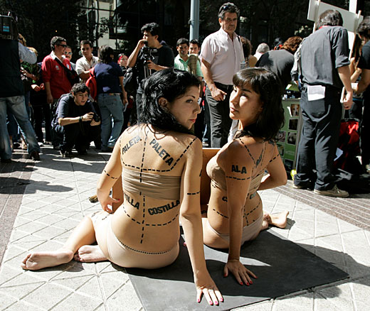 中新网3月20日电 美联社消息,当地时间3月19日,来自AnimaNaturalis动物保护组织的智利美女在首都圣地亚哥举办了一场别出心裁的“裸身切割”活动,呼吁民众保护动物。