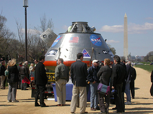 据报道,国家航空和航天局30日在美国华盛顿市中心的国家大草坪上展出了实物大小的猎户座飞船模型。