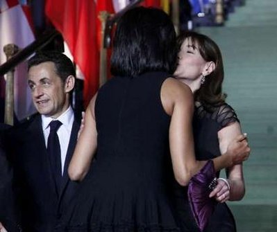 中新网4月5日电 美国总统奥巴马与夫人米歇尔到访法国时再施展魅力,连一向热情奔放的法国第一夫人布吕尼(Carla Bruni)也似乎被他的魅力慑住,突然变得害羞起来。布吕尼本想以法式颊吻与奥巴马打招呼,但却中途改变主意,改为与奥巴马握手。而她和奥巴马夫人热吻。这一含蓄举动成为民众热话。