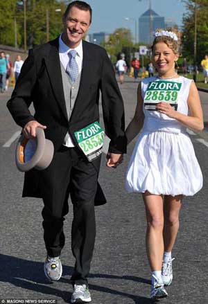 他们俩在比赛开始后七小时零五分钟才跑到终点。新娘把花束掷向群众时,新郎甚至有气力支撑着她走过终点。皮特说:“这是我一生中最美好的一天,但我决定不再做这种事了。”